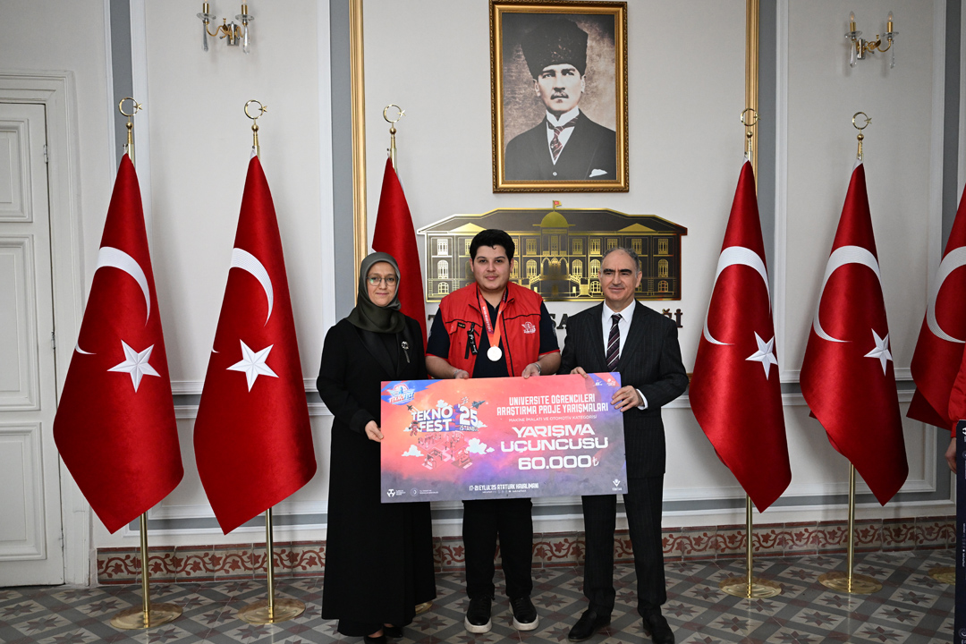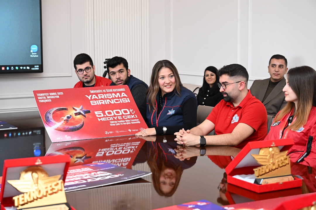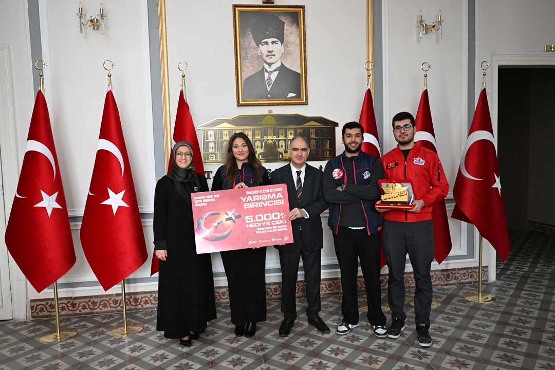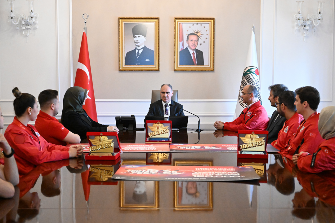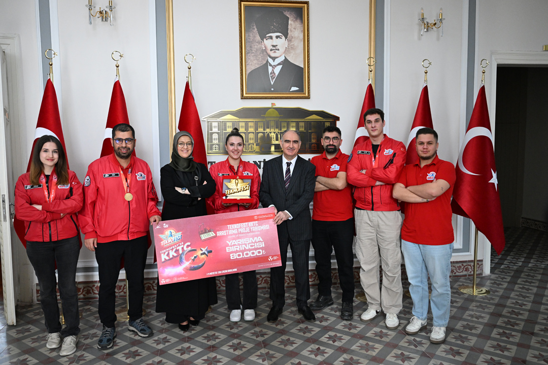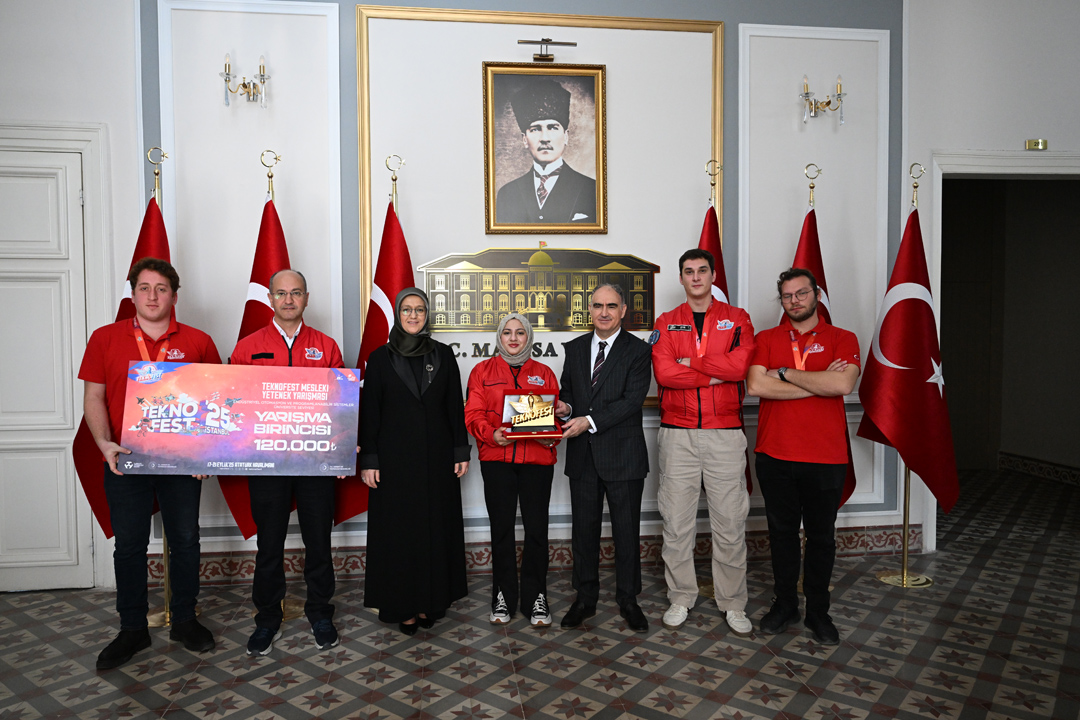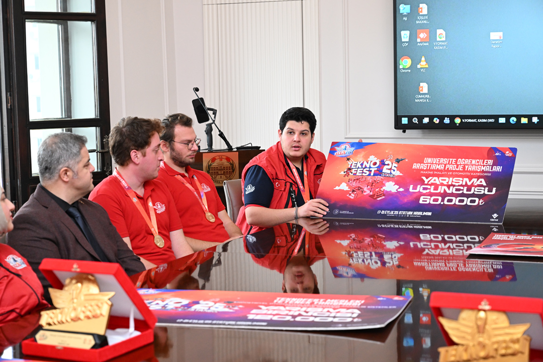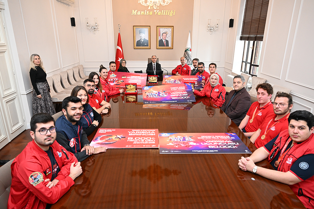 Rektör Prof. Dr. Rana Kibar, TEKNOFEST 2025’te derece elde eden öğrencilerle birlikte Manisa Valisi Vahdettin Özkan’ı makamında ziyaret etti. Ziyarette, üniversite takımlarının hem Kuzey Kıbrıs Türk Cumhuriyeti (KKTC) Eski Ercan Havalimanı’nda hem de İstanbul Atatürk Havalimanı’nda gerçekleştirilen TEKNOFEST 2025 yarışmalarında gösterdikleri üstün başarılar ele alındı.