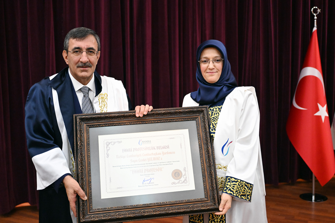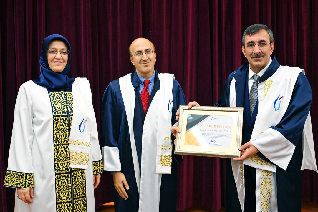 Program, Fahri Profesörlük Belgesi Töreni ile devam etti. Rektörümüz Rektör Prof. Dr. Rana Kibar tarafından, Cumhurbaşkanı Yardımcısı Cevdet Yılmaz’a, ülkemizin dış ilişkiler, ekonomi, planlama ve yönetim alanlarında gerçekleştirdiği üstün hizmetleri nedeniyle Fahri Profesörlük Belgesi tevdi edildi.