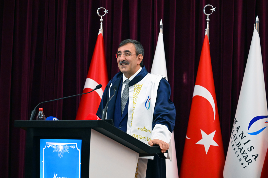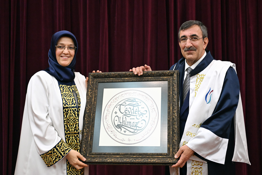 Fahri Profesörlük Töreni sonrasında, kürsüye davet edilen Türkiye Cumhuriyeti Cumhurbaşkanı Yardımcısı Cevdet Yılmaz, Üniversitemizin kendisine tevdi ettiği Fahri Profesör ünvanından onur duyduğunu ve gururla taşıyacağını belirterek sözlerine başladı.