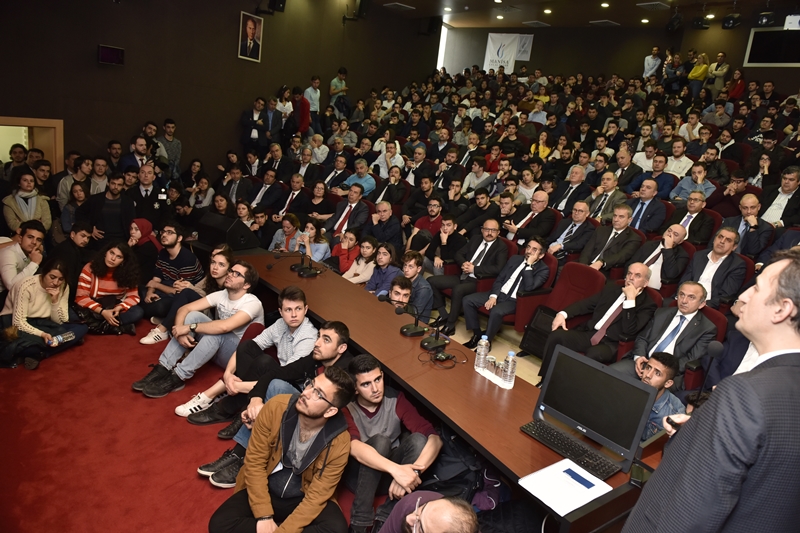 Prof. Dr. Haluk Görgün; Yıldız Teknik Üniversitesinde Rektör Yardımcılığı, Gebze Teknik Üniversitesinde Rektörlük yapmış bir akademisyen olarak öğrencilerle tekrar bir araya gelmekten büyük mutluluk duyduğunu belirterek başladığı konuşmasında, “Türkiye’de savunma sanayiinde çalışan insan kaynağına baktığımızda 45 bini geçmediğini görüyoruz. Oysa bizim gibi bu alanda önemli atılımları olan bir ülkede bu sayının 400-500 binlere ulaşması gerekiyor. Biliyoruz ki bugün kullandığımız internet teknolojisinden, mobil cihazlara kadar pek çok şeyin aslında ilk uygulaması ve AR-GE çalışmaları savunma sanayisinden geçti. Dolayısıyla bu alana ne kadar çok insan ilgi duyar ve çalışma yaparsa ekonomik ve teknolojik bağımsızlığımızı o kadar çabuk kazanırız. Ben ve ekibim, bu tanıtım programlarımızı ayda bir veya iki kere yapıyoruz, bundan sonra da devam edeceğiz. Savunma ekosisteminin tüm illerimize yayılması için gayret göstereceğiz. Bu programlarda Millileştirme ve Yerlileştirme Üst Kurulumuzun ön plana çıkardığı kritik teknolojileri, nasıl bir yerlileştirme yol haritasına sahip olduğumuzu anlatıyoruz. Ben burada bu konuşmayı yaparken, başka bir ekibimiz de Ticaret ve Sanayi Odasında bir sunum yapıyor.
