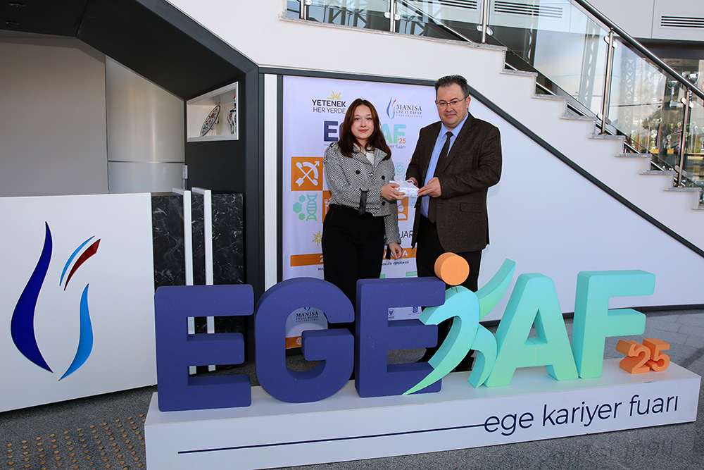 Öğrencimize hediyesini takdim eden Rektör Yardımcısı Prof. Dr. Kadir Ay, “Öğrencimizi tebrik ediyorum. EGEKAF'25 için tüm öğrencilerimizi fuara kaydolmaya ve bu harika etkinliğe katılmaya davet ediyoruz. Bu fırsatı kaçırmayın ve EGEKAF'25'in heyecan dolu atmosferine katılın, hemen kaydolun ve şansınızı kaçırmayın” ifadesini kullandı.