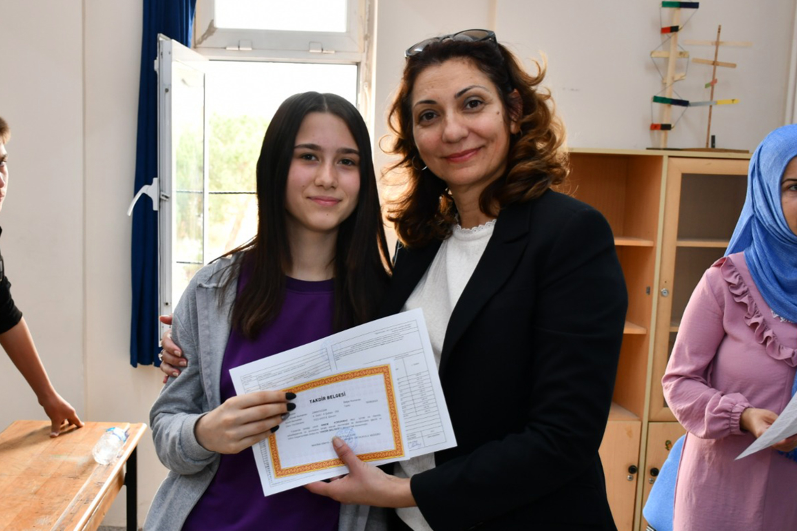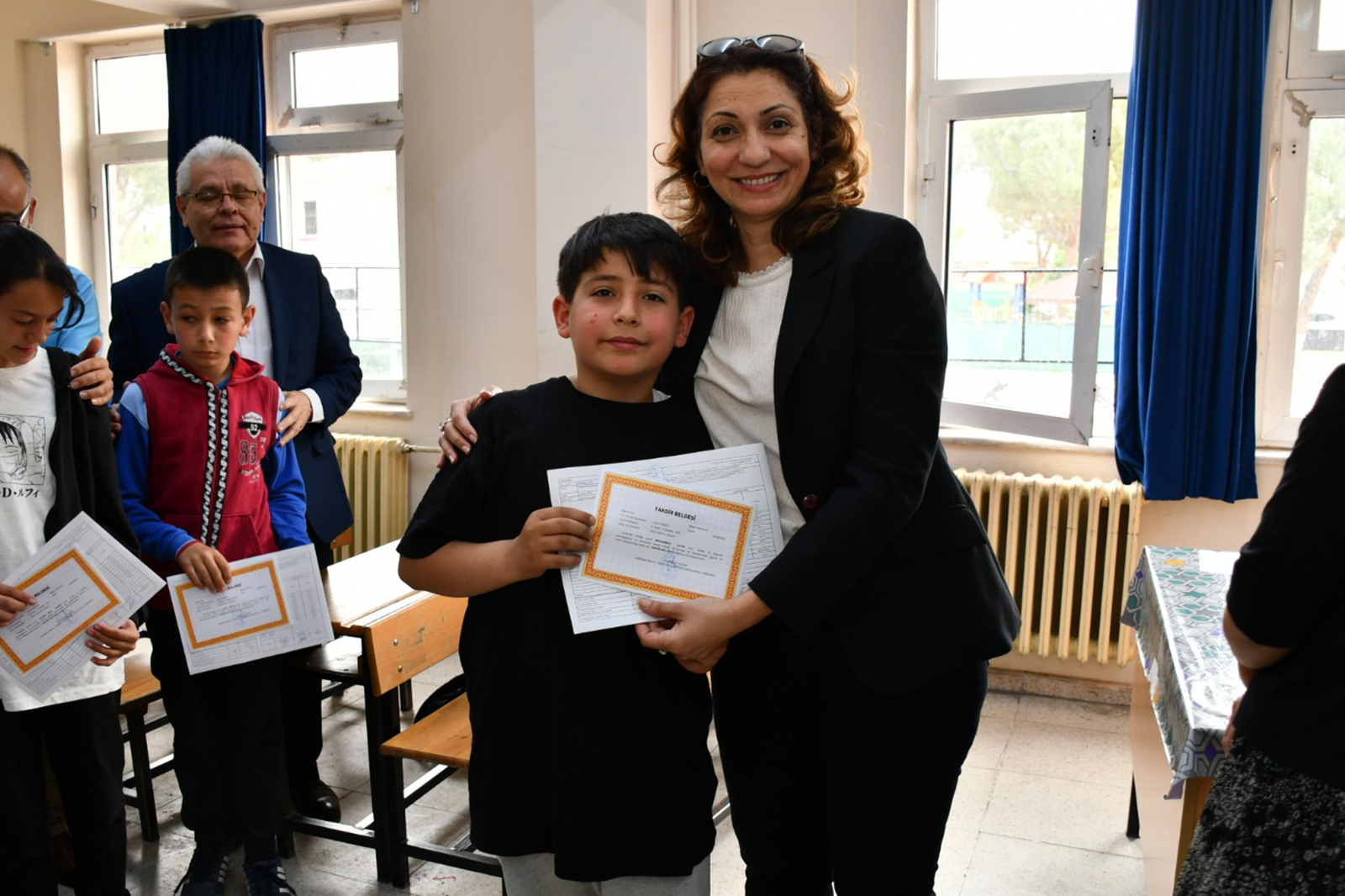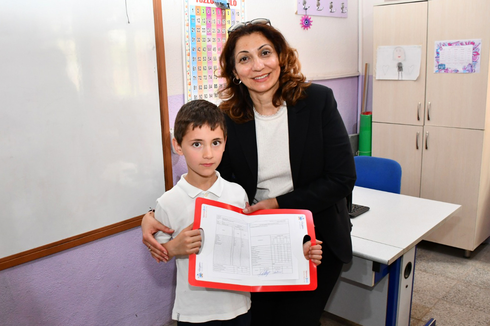 Sınıfları ziyaret eden protokol üyeleri, öğretmenler ile birlikte öğrencilere hediyeler vererek, karne takdimini gerçekleştirdi.