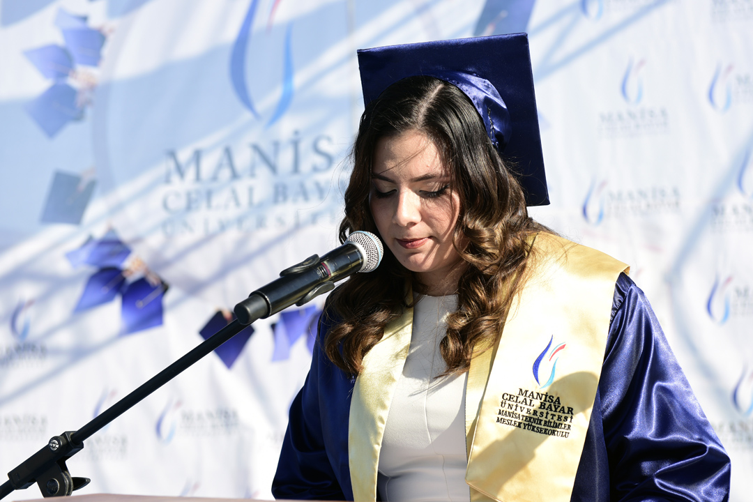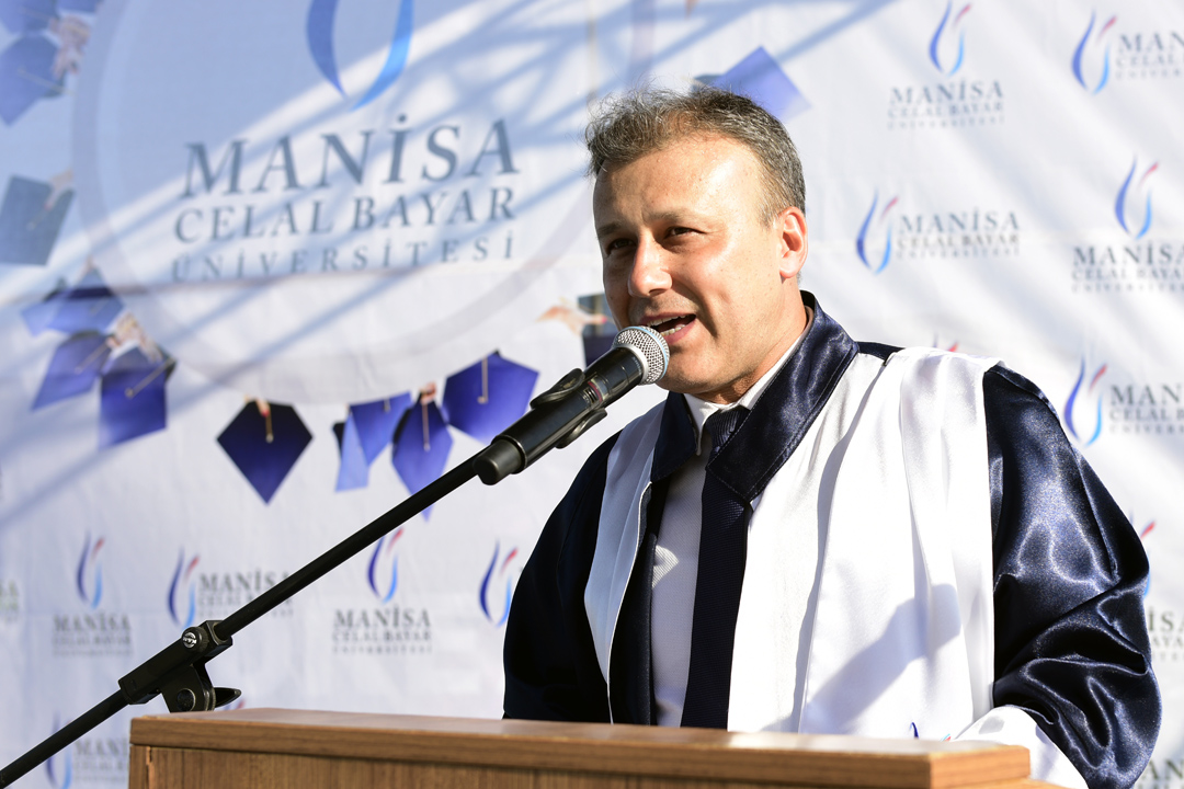 Rektör Yardımcısı Prof. Dr. Kadir Ay, Manisa Celal Bayar Üniversitesi’nin gençleri hayata donanımlı bireyler olarak hazırlama misyonunu vurgulayarak, “Sizler yalnızca birer mezun değil, aynı zamanda ülkemizin geleceğini şekillendirecek önemli aktörlersiniz. Üniversitemiz sizlere mesleki becerilerin yanı sıra, etik değerlere bağlı ve topluma duyarlı bireyler olma bilincini de kazandırdı. Bundan sonraki yaşamınızda bu kazanımları en iyi şekilde değerlendireceğinize inanıyorum” dedi.
