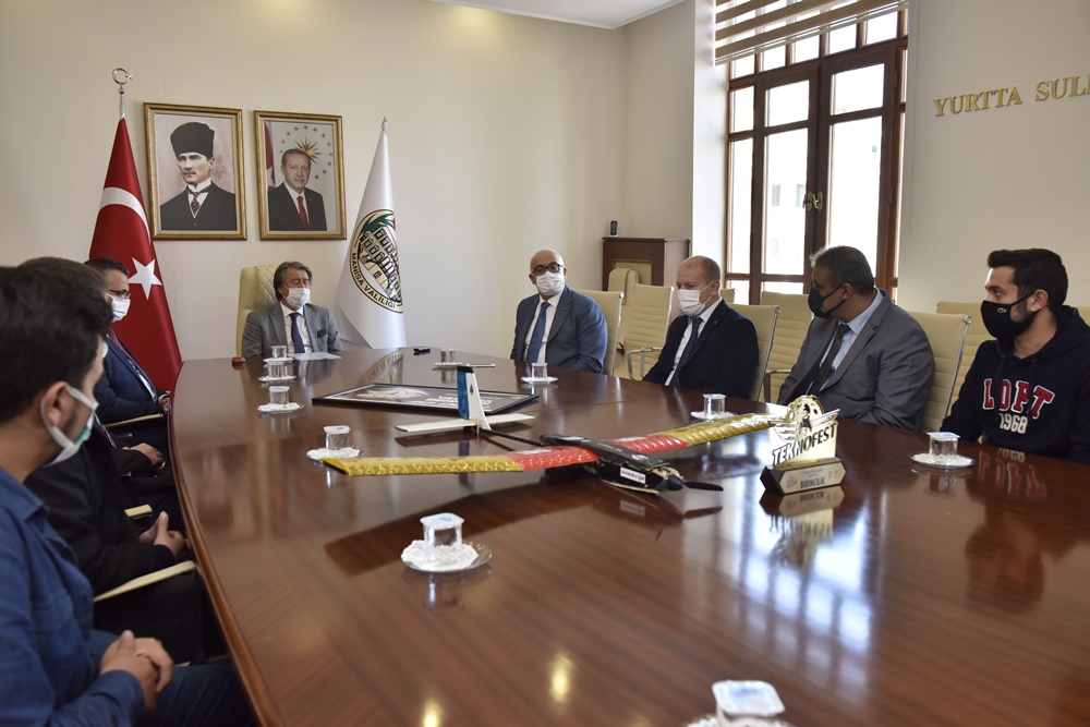 Ziyarette söz alan KAYGUSUZ Takımı üyesi Furkan Bellibaş, süreçte kendilerini her konuda destekleyen başta Rektör Ataç ve Fakülte Dekanları olmak üzere teşekkür ederek başladığı konuşmasını “Geçen yıl pandemi nedeniyle yarışmaya katılamadık ancak pes de etmedik. Kendi çabamızla uçağımızı ürettik. Yarışma tarihinin en hafif ve görevini başarıyla yapabilen İHA’sı oldu.” şeklinde sürdürdü.